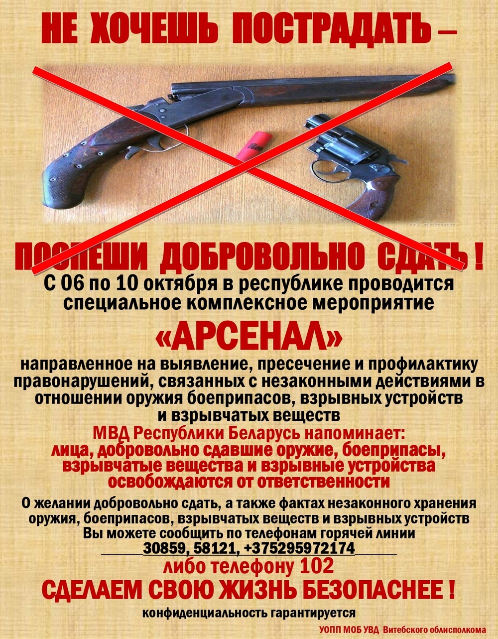 Уважаемые граждане! С 6 по 10 октября 2025 года органами внутренних дел проводятся оперативно-профилактические специальные комплексные мероприятия «Арсенал», целью которых является предупреждение и пресечение правонарушений в сфере оборота оружия.